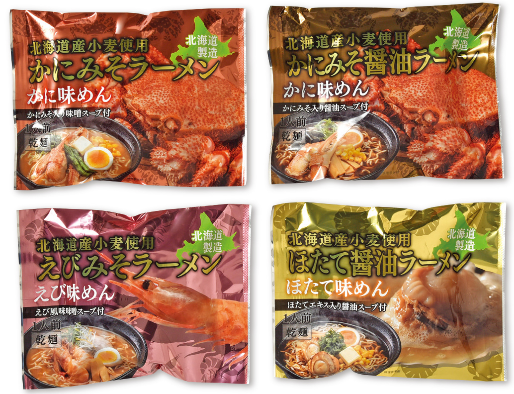 海鮮乾麺(ほたて醤油・えびみそ・かにみそ・かにみそ醤油)/各1食