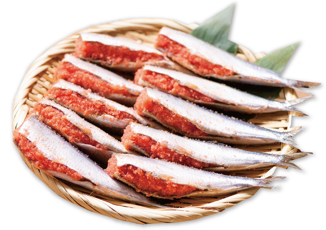 太平洋で水揚げされた脂ののった真いわしを原料に使用しています。辛味の調味液に一晩じっくりと漬け込み、相性抜群の辛子明太子を贅沢にサンドしました。
