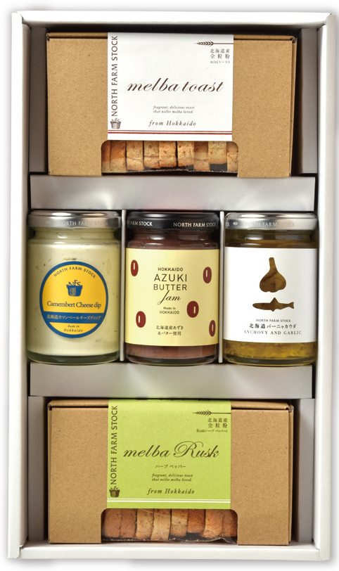 | 内容量 | メルバトースト/11枚入、メルバラスク(ハーブペッパー)/10枚入、北海道カマンベールチーズディップ・北海道バーニャカウダ/各120g、北海道あずきバタージャム/130g | ||