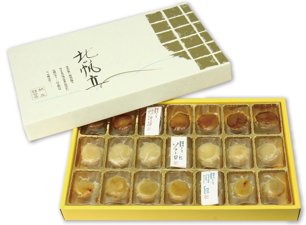 帆立貝柱商品、「帆立燻油漬」「ソフト貝柱」「ほたて関白」の異なる三種の味を詰合せた北の帆立。その妙味をお楽しみいただける逸品です。