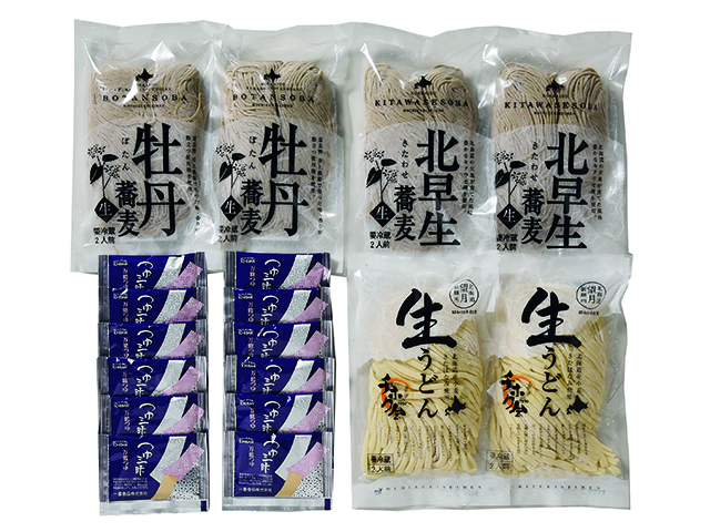 北竜産北早生そば、富良野産牡丹そば/各(120g×2)×2袋、チホク会小麦生うどん/280g×2袋、万能めんつゆ/30g×12