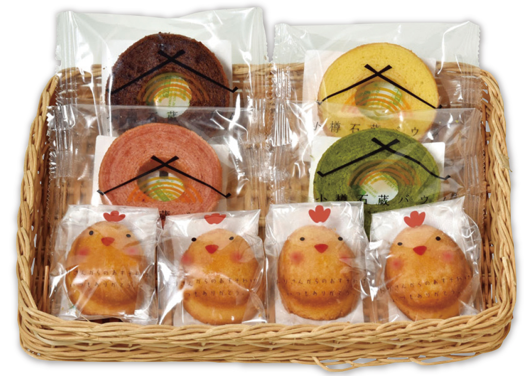 トリさんが運ぶ、ふんわり幸せセット。小樽石蔵バウムのトリさん4個と、ちびバウム4種を詰め合わせ。見ても食べてもほっこり笑顔になるセットです。