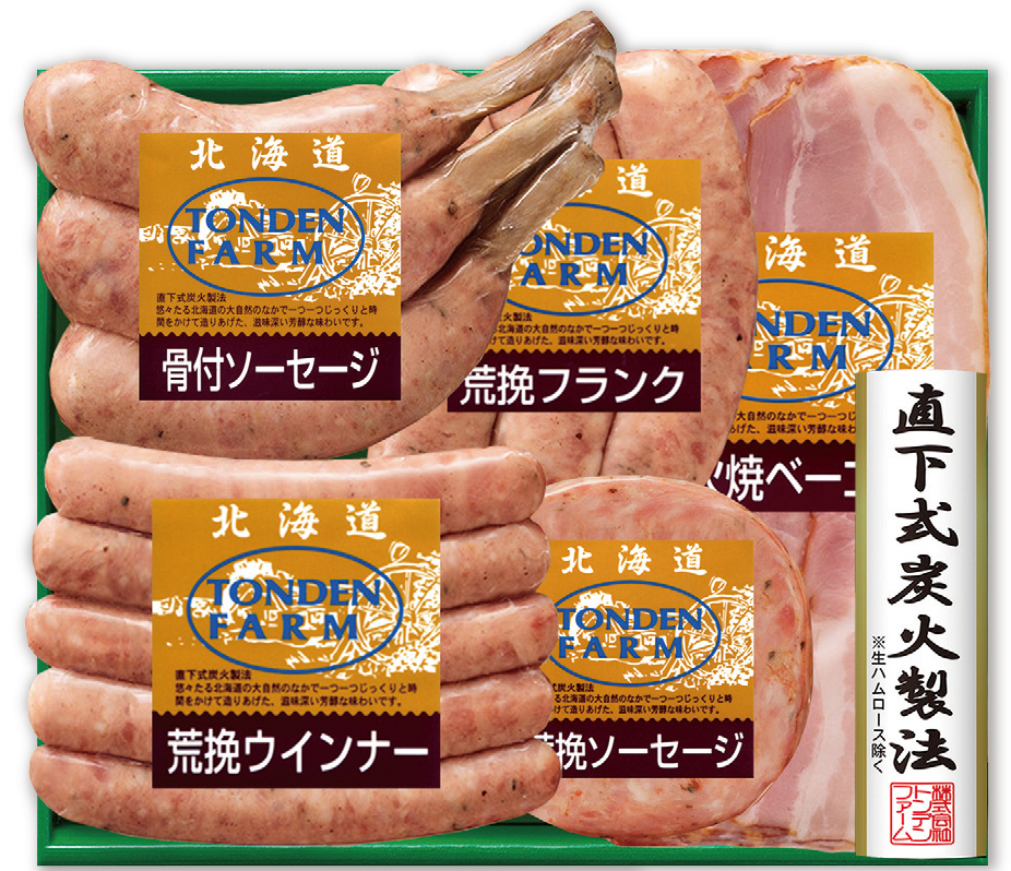 炭火焼ベーコンスライス/80g、骨付ソーセージ/180g、荒挽ウインナー/100g、荒挽フランク/150g、荒挽ソーセージ/70g
