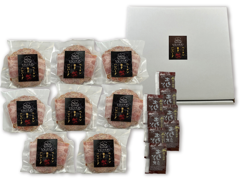北海道産の豚肉と鶏肉を使用した、オリジナルハンバーグにベーコンを巻きつけたハンバーグです。ポーク&チキンのサッパリしたハンバーグにベーコンの旨味と香りがプラスされた逸品です。添付のオリジナルおろしソースでお召し上がりください。