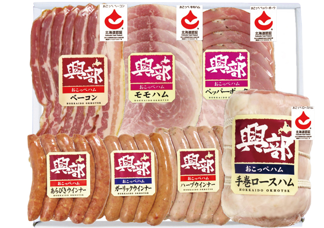 北海道認証手巻きロースハム/600g、北海道認証ベーコンスライス/80g、北海道認証モモハムスライス・北海道認証ペッパーポークスライス/各85g、あらびきウインナー・ガーリックウインナー・ハーブウインナー/各95g